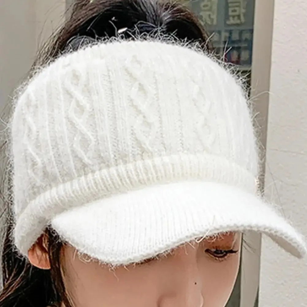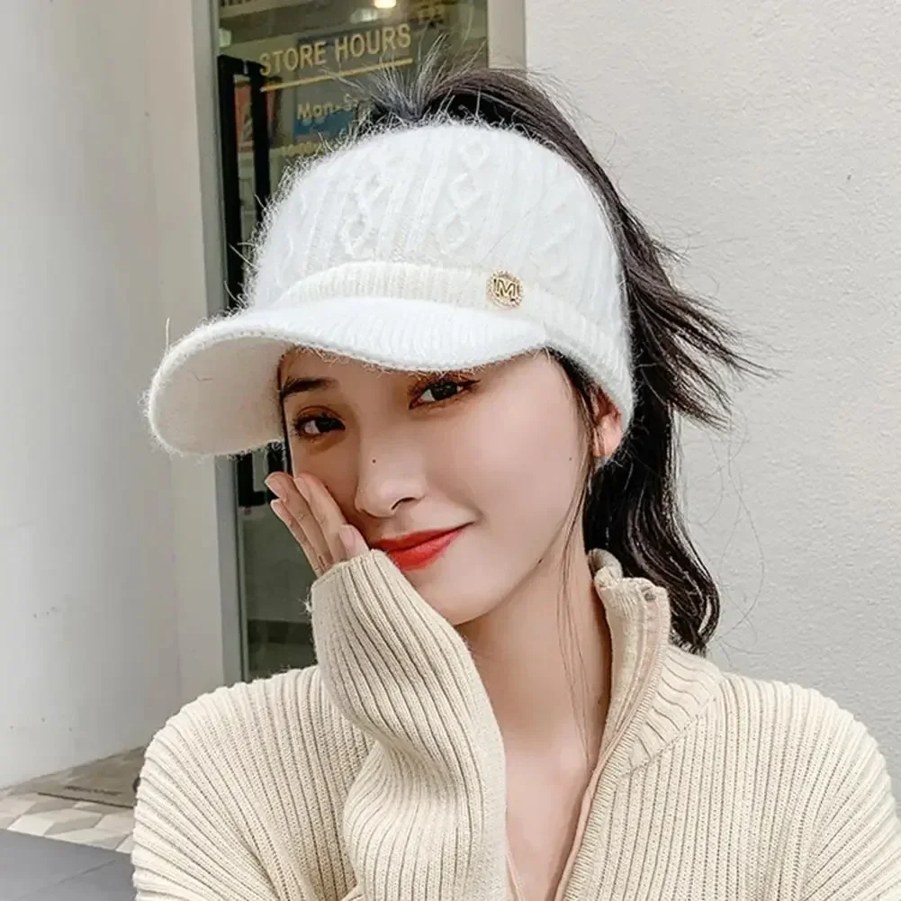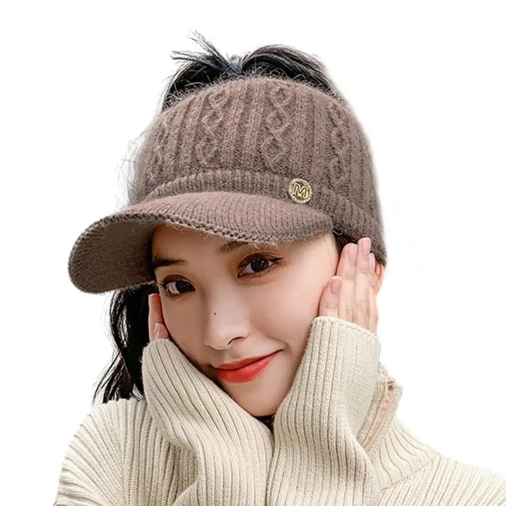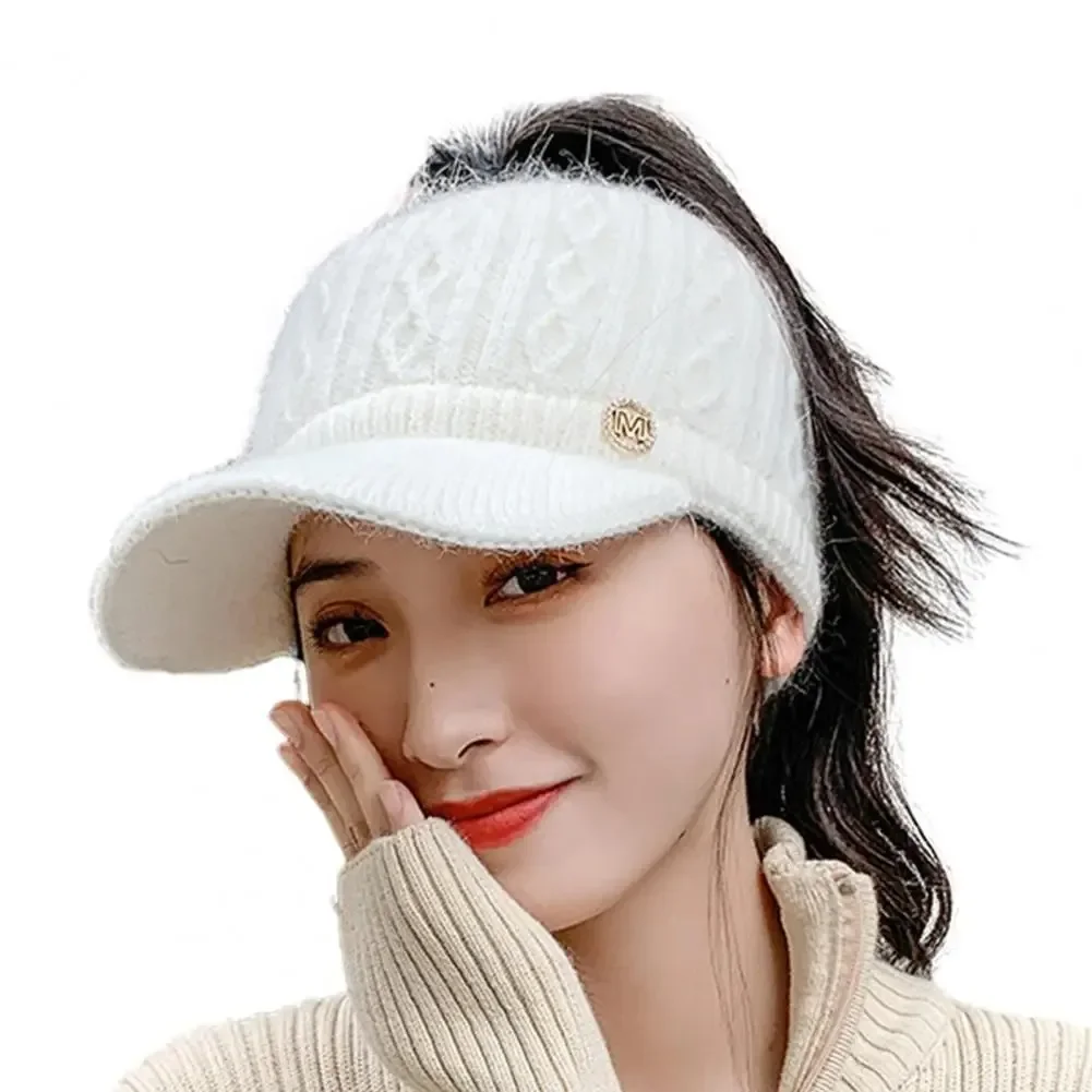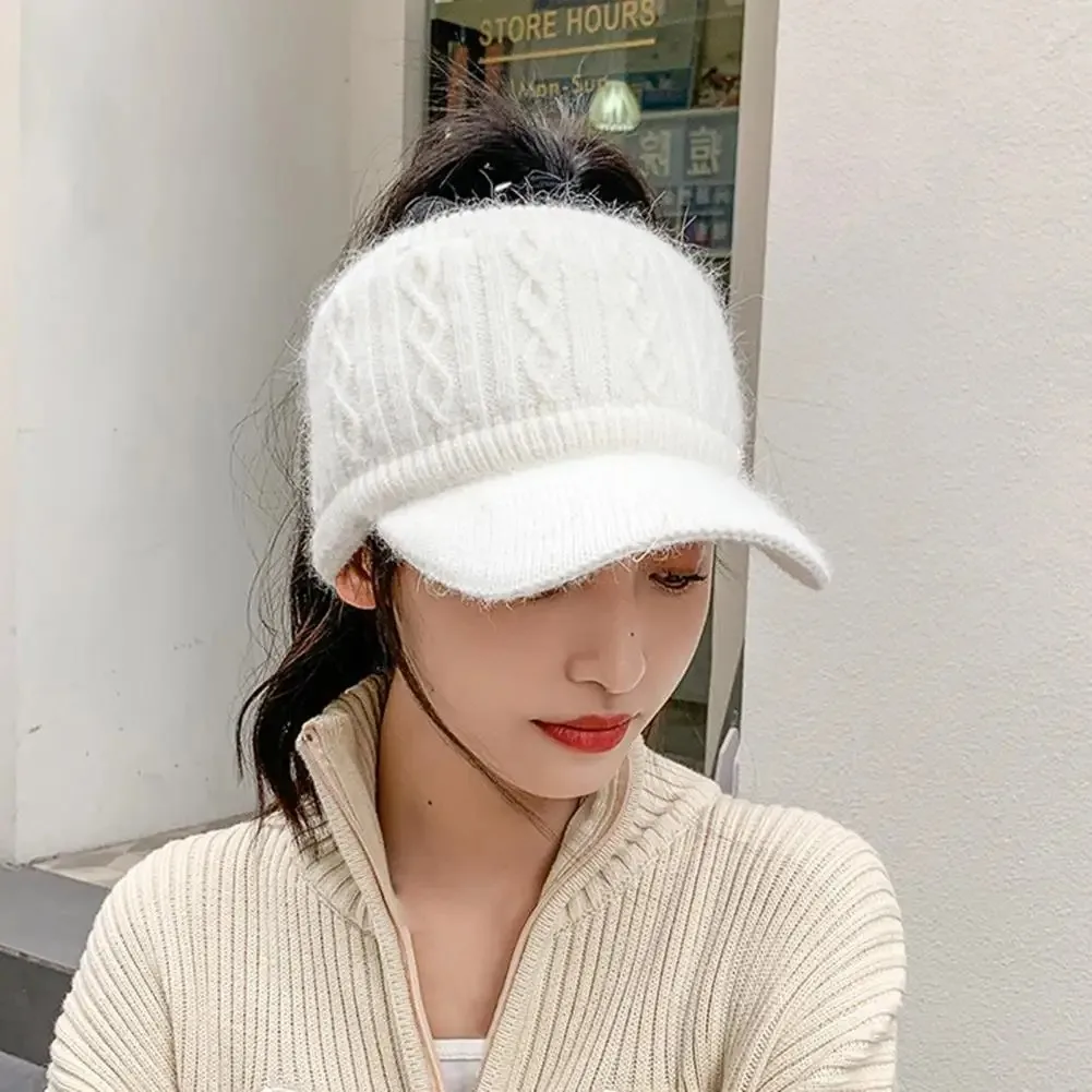 2025Winter Knitted Rabbit Fur Beanie With Visor Ponytail Opening For Women Golf Baseball Outdoor Sports Warm Hat Kpop Style