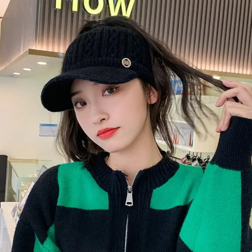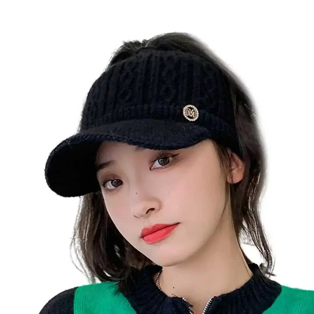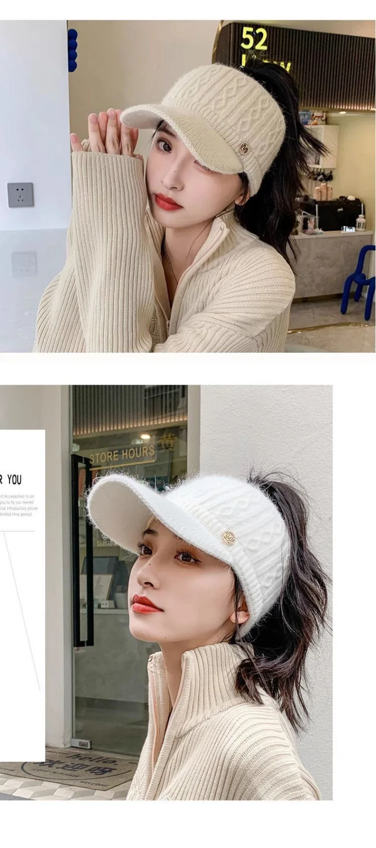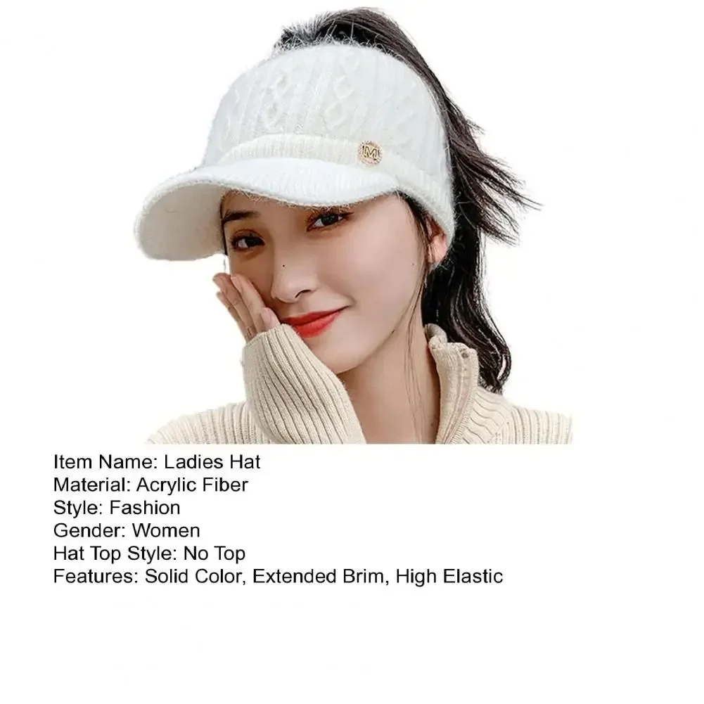 2025Winter Knitted Rabbit Fur Beanie With Visor Ponytail Opening For Women Golf Baseball Outdoor Sports Warm Hat Kpop Style