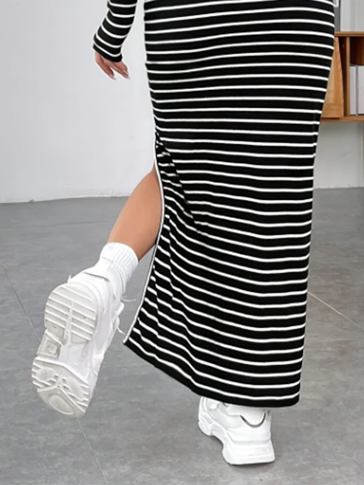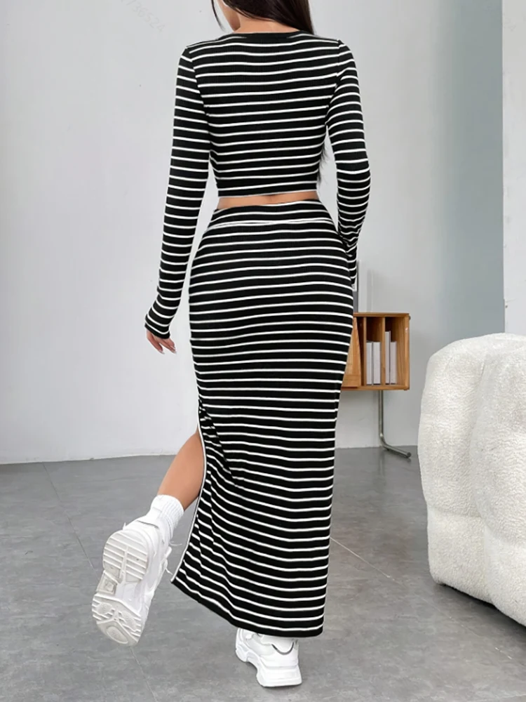2Pcs Women's Casual Long Skirt Set 2025 Fashion Black And White Striped Square Neck Long Sleeved Top Side Slit Tightening Skirt