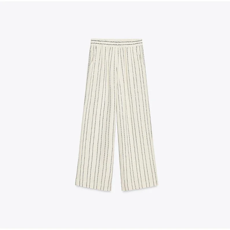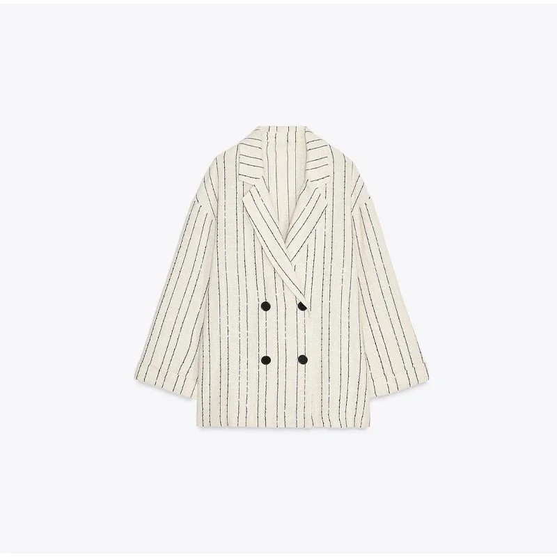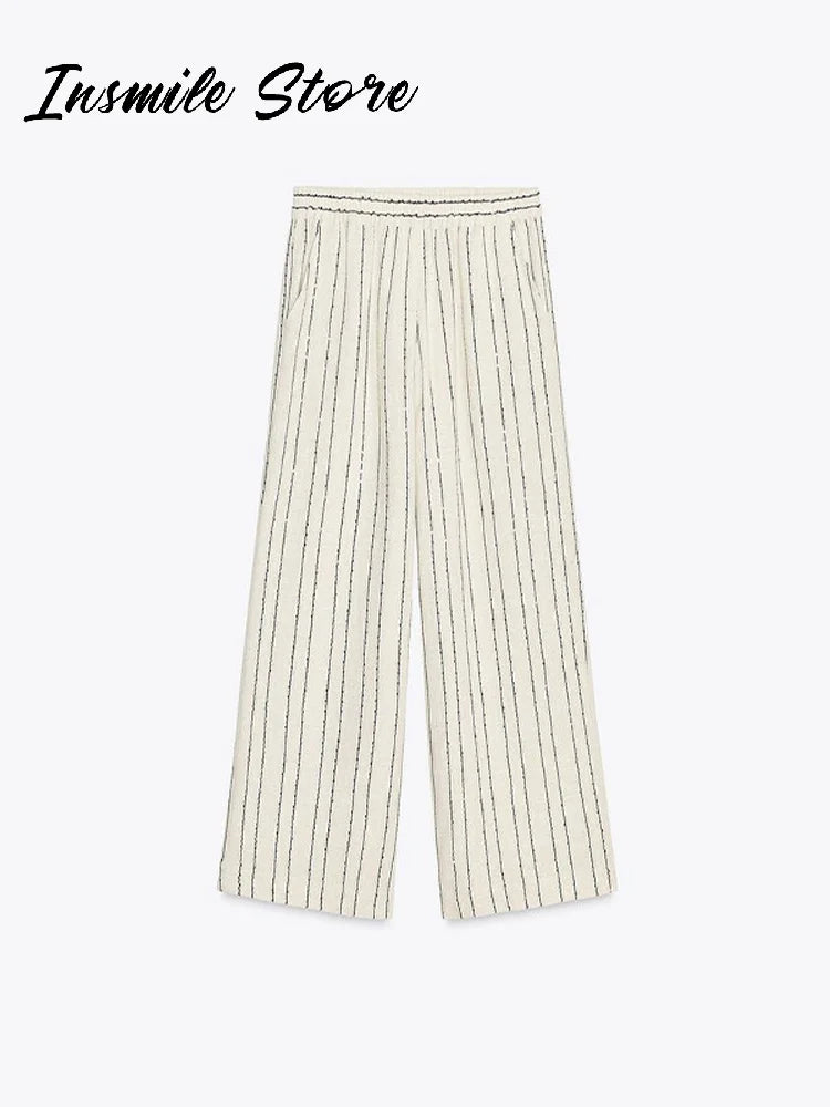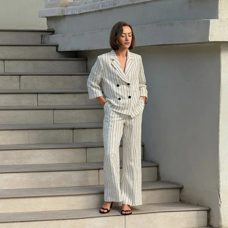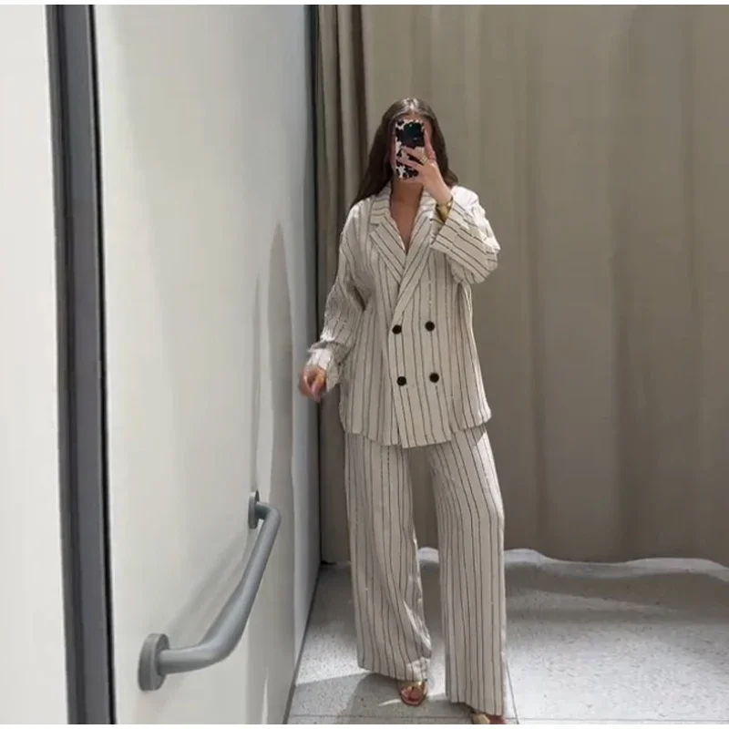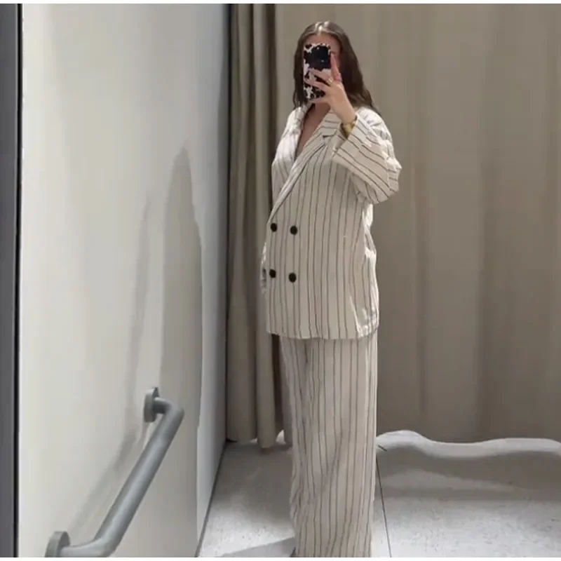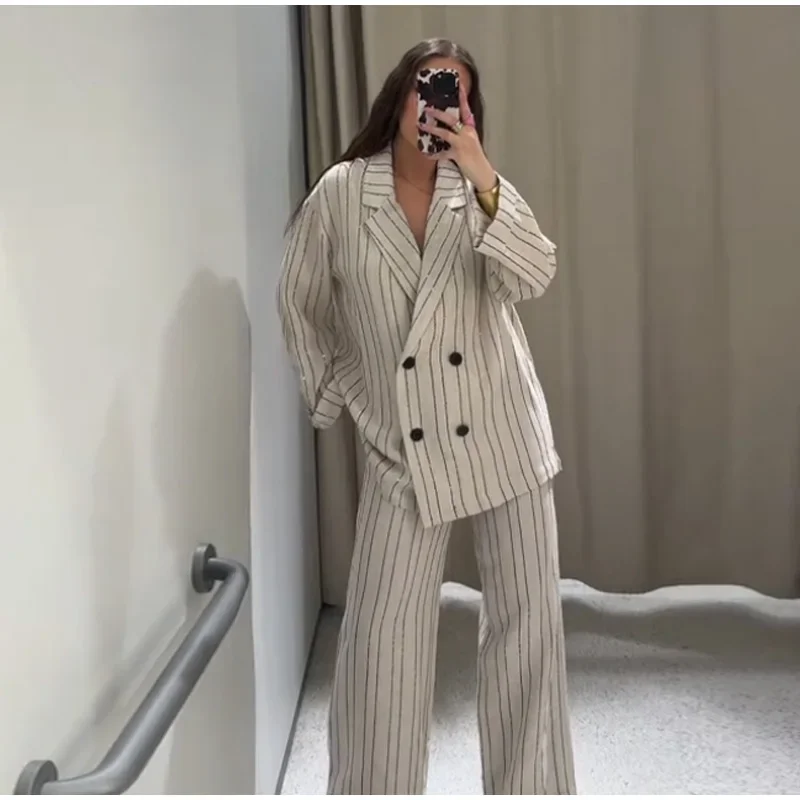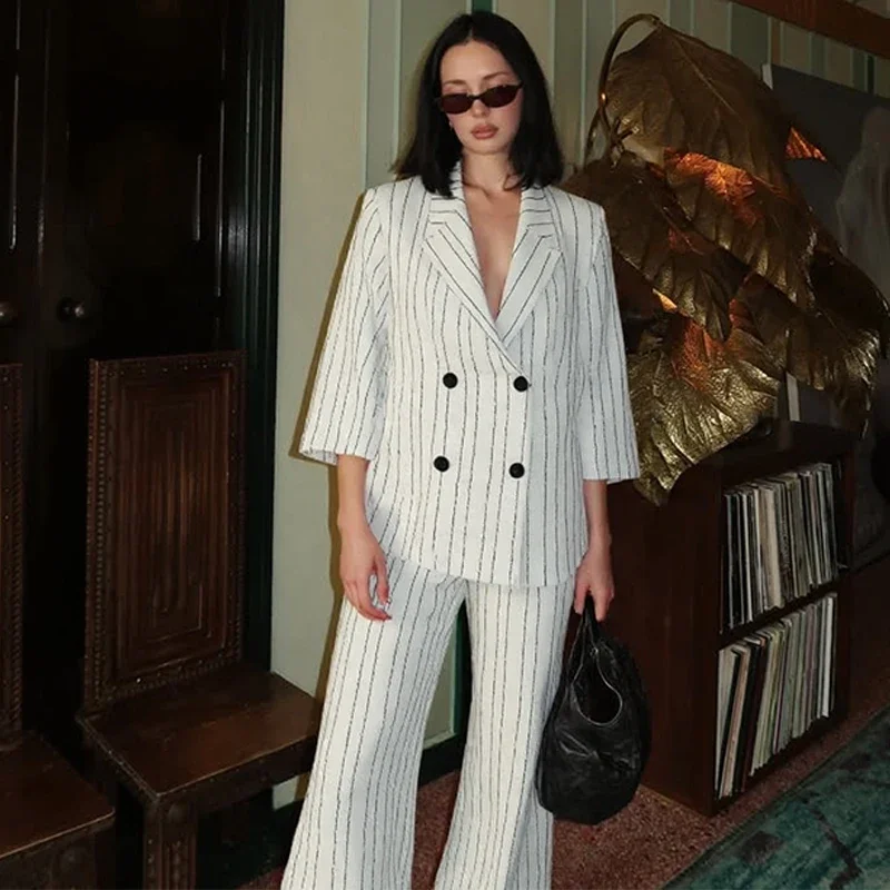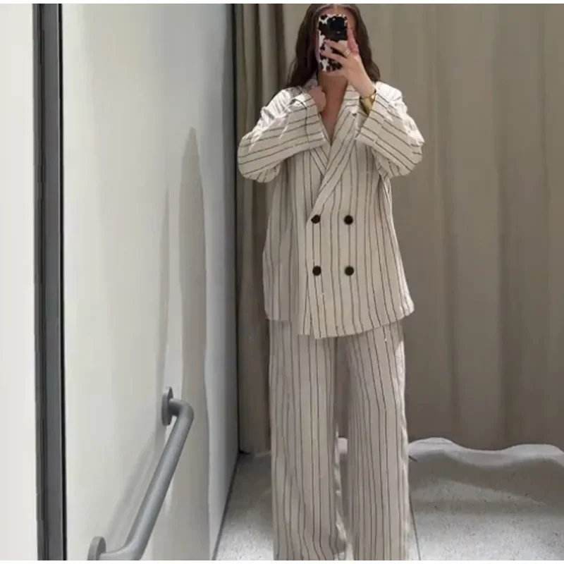 Classic Striped Blazer Trouser Suit Women Double Breasted Lapel Full Sleeve Jacket Loose Straight Pant 2025 Office Lady Outfit