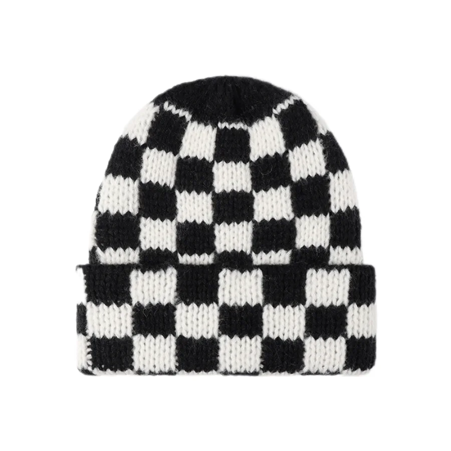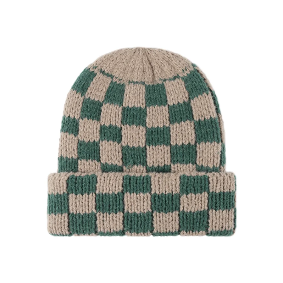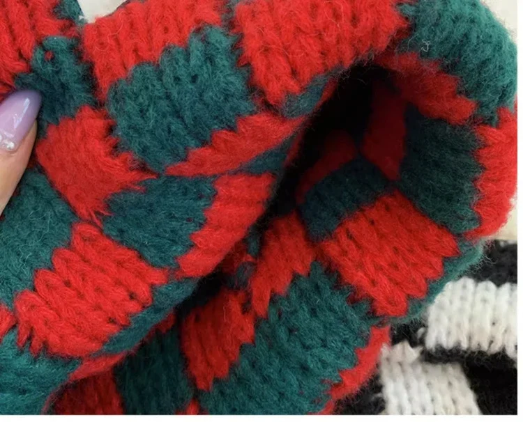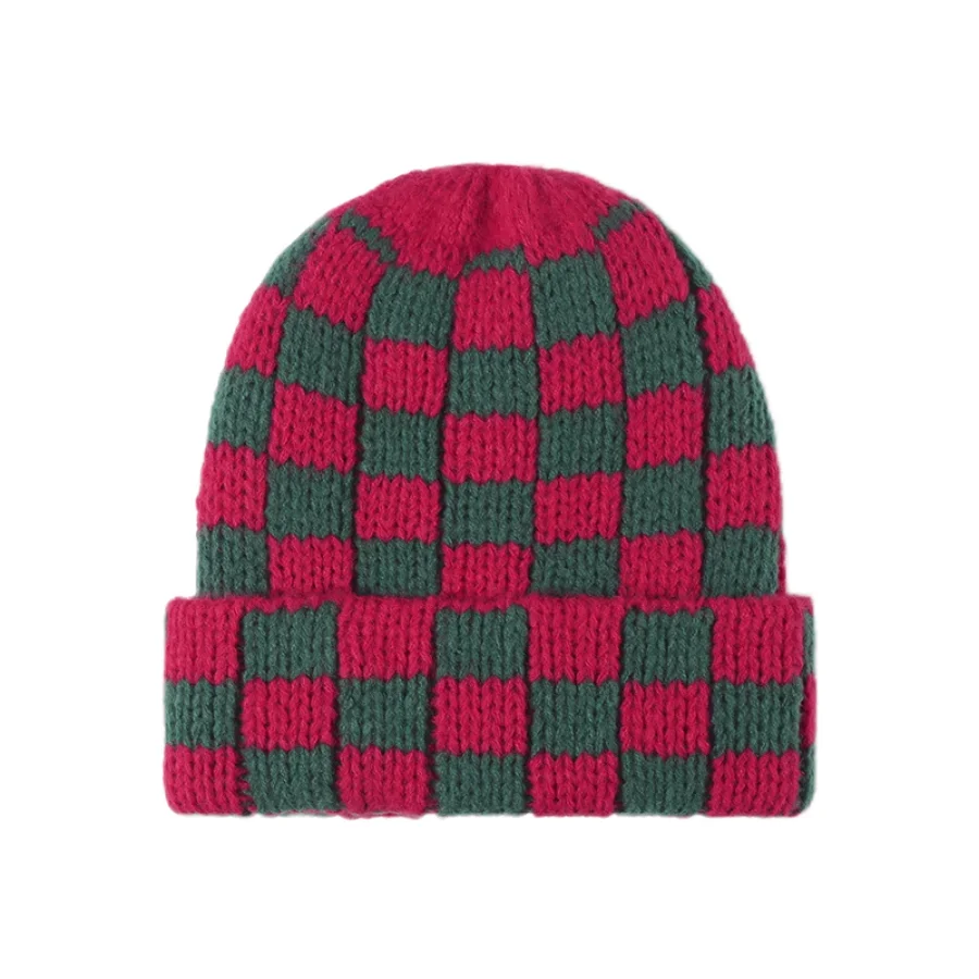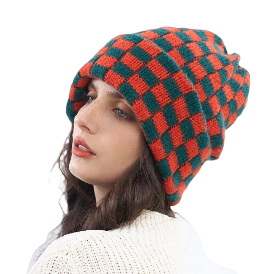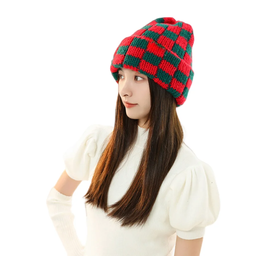 Fashion Vintage Chessboard Plaid Knitted Hat Women Winter New Big Size Hat Warm Beanies Green Red Xmas Christmas Hat