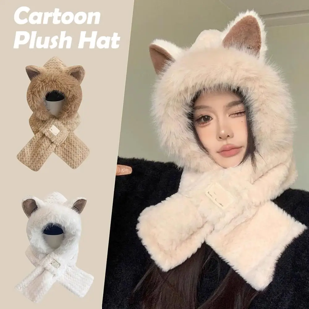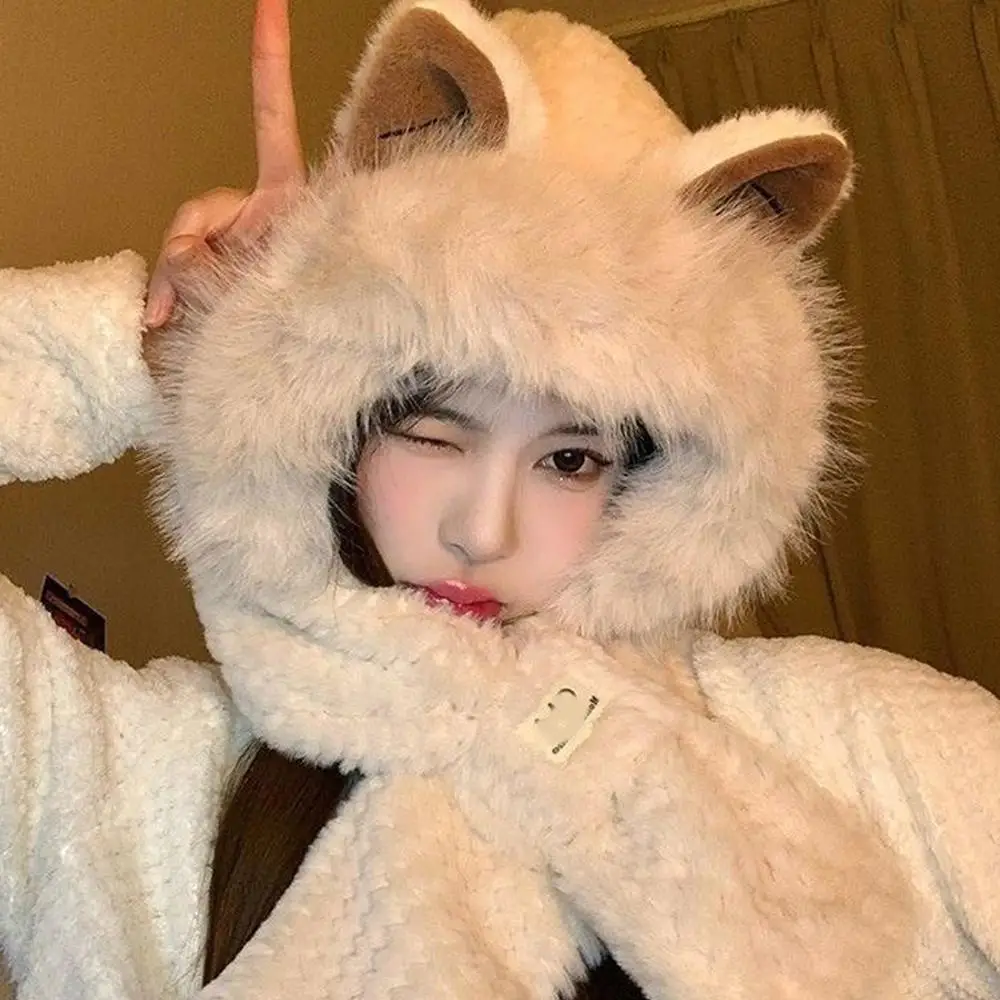 Lovely Beanie Hat Scarf Set Women Faux Fur Warm Winter Hat Neck Circle Scarf Ski Snow Hat Cap Bear Plush Hat Ear Protection