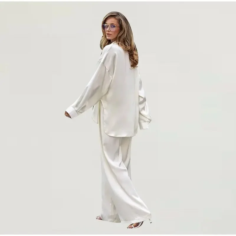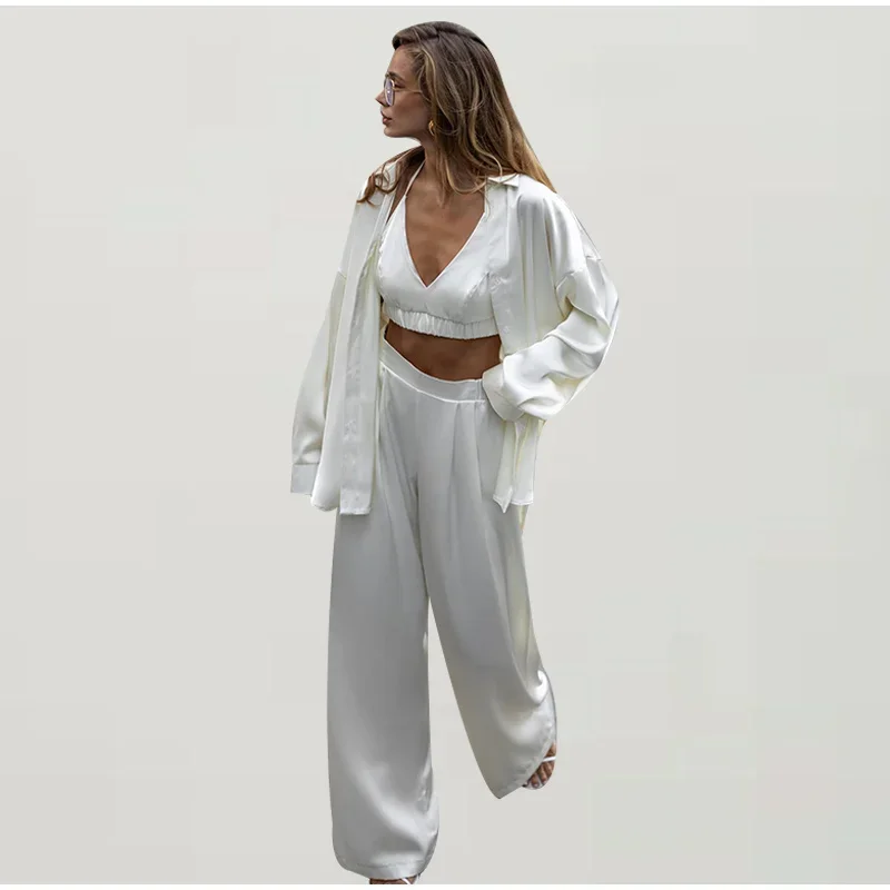 Sexy Loose Silk 3 Piece Sets Women Outfit Fashion Long Sleeve Shirts Bra With High Waist Wide Pants Set Lady Outfit 2025