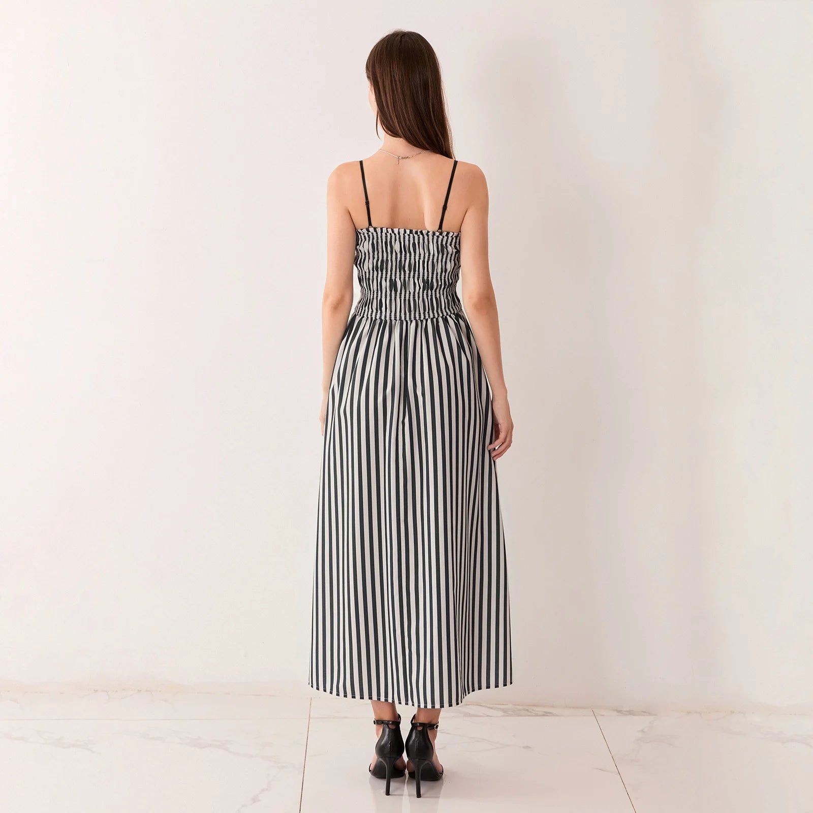 Striking Striped Pattern: Vertical stripes elongate the figure for a sleek, slimming effect.