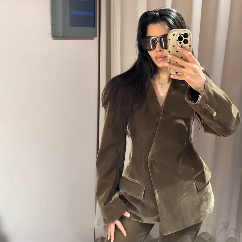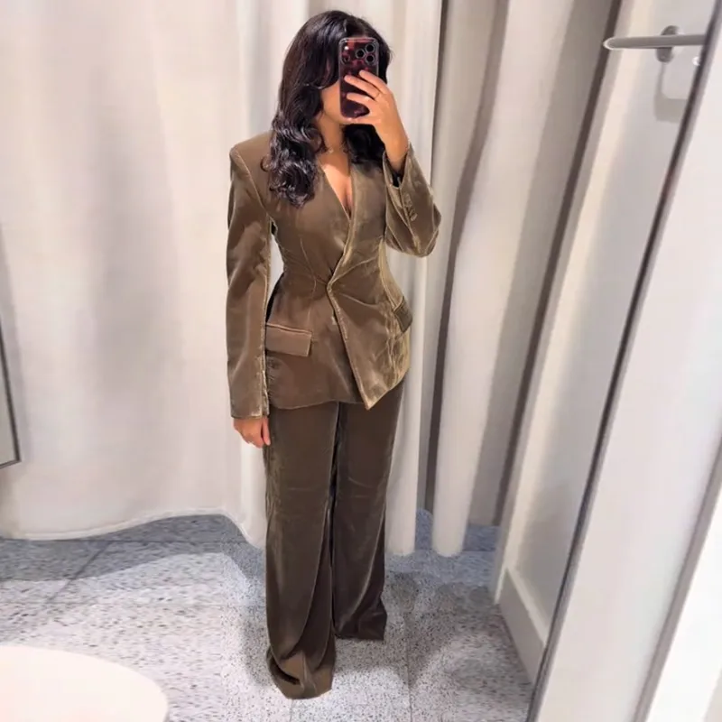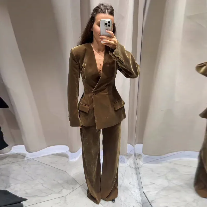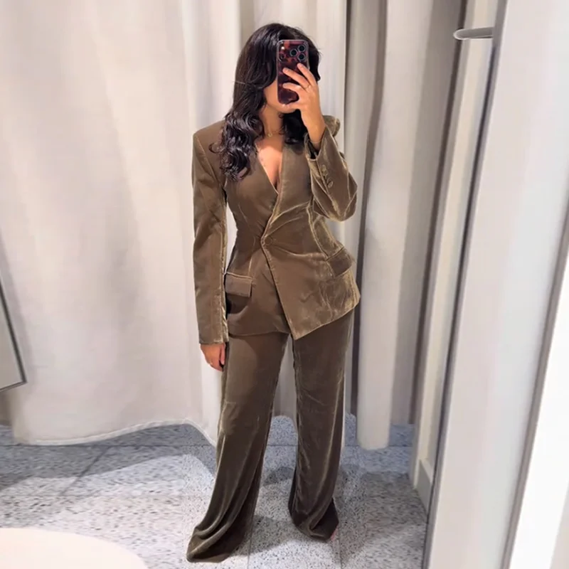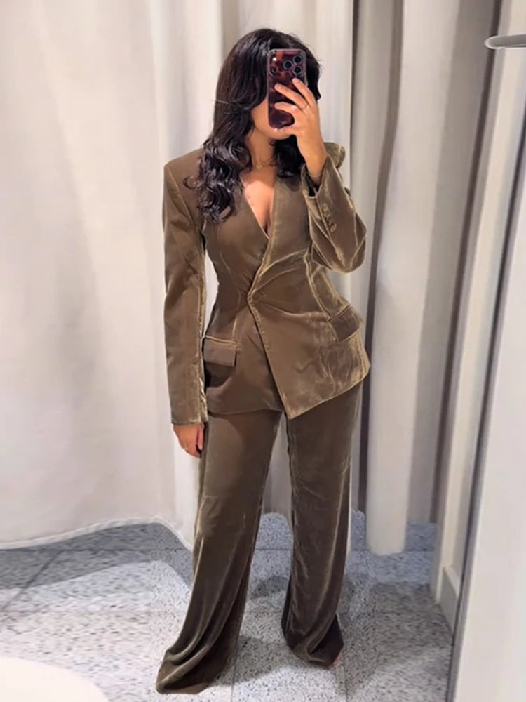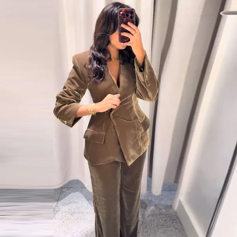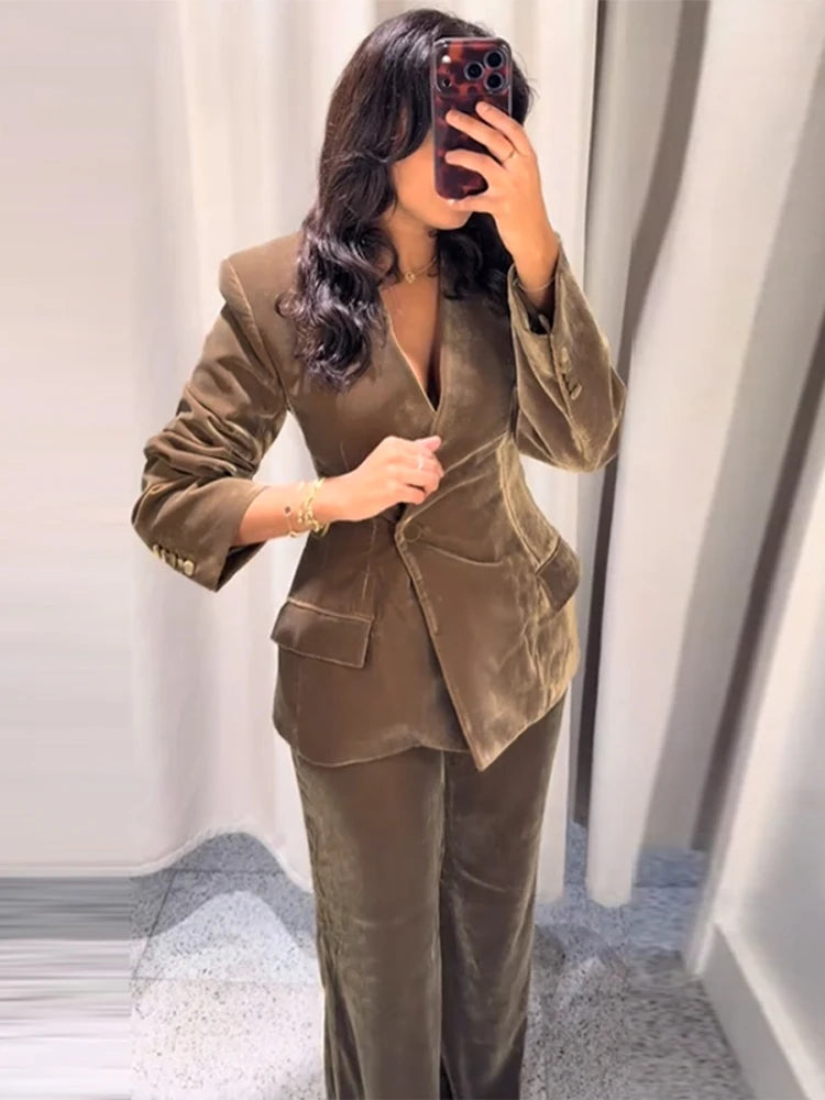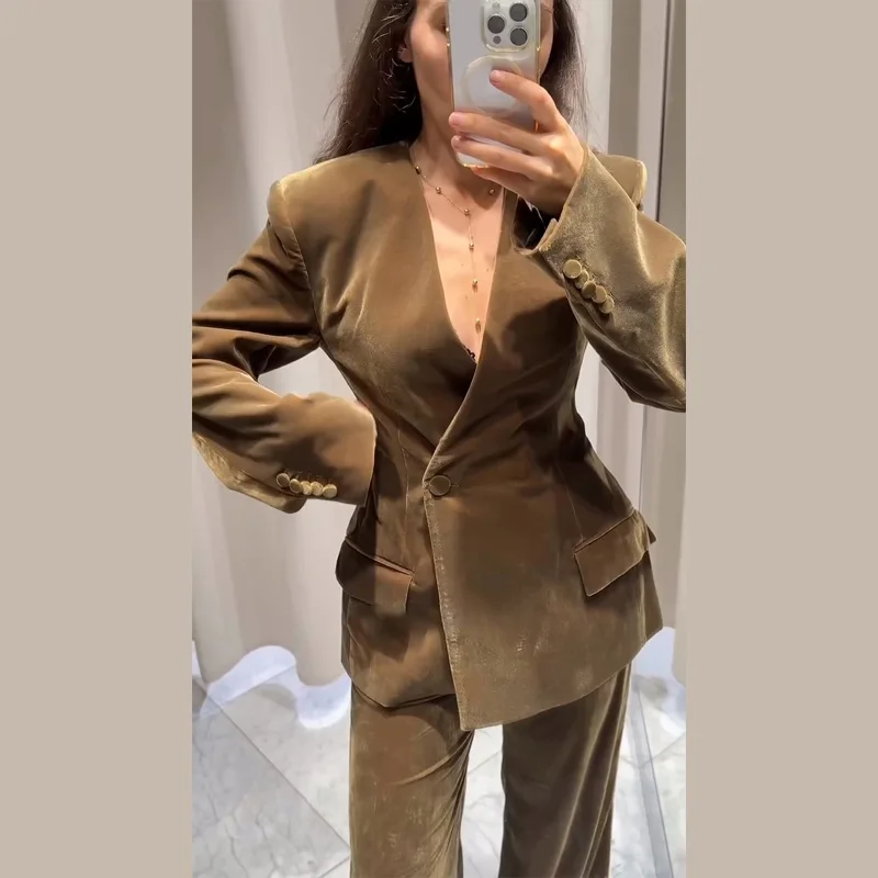 Vlvet Women's Coat Pants Set Turn-down Collar One Button Coats Straight Trousers Female Suit 2025 Autumn Elegant Chic Lady Suits
