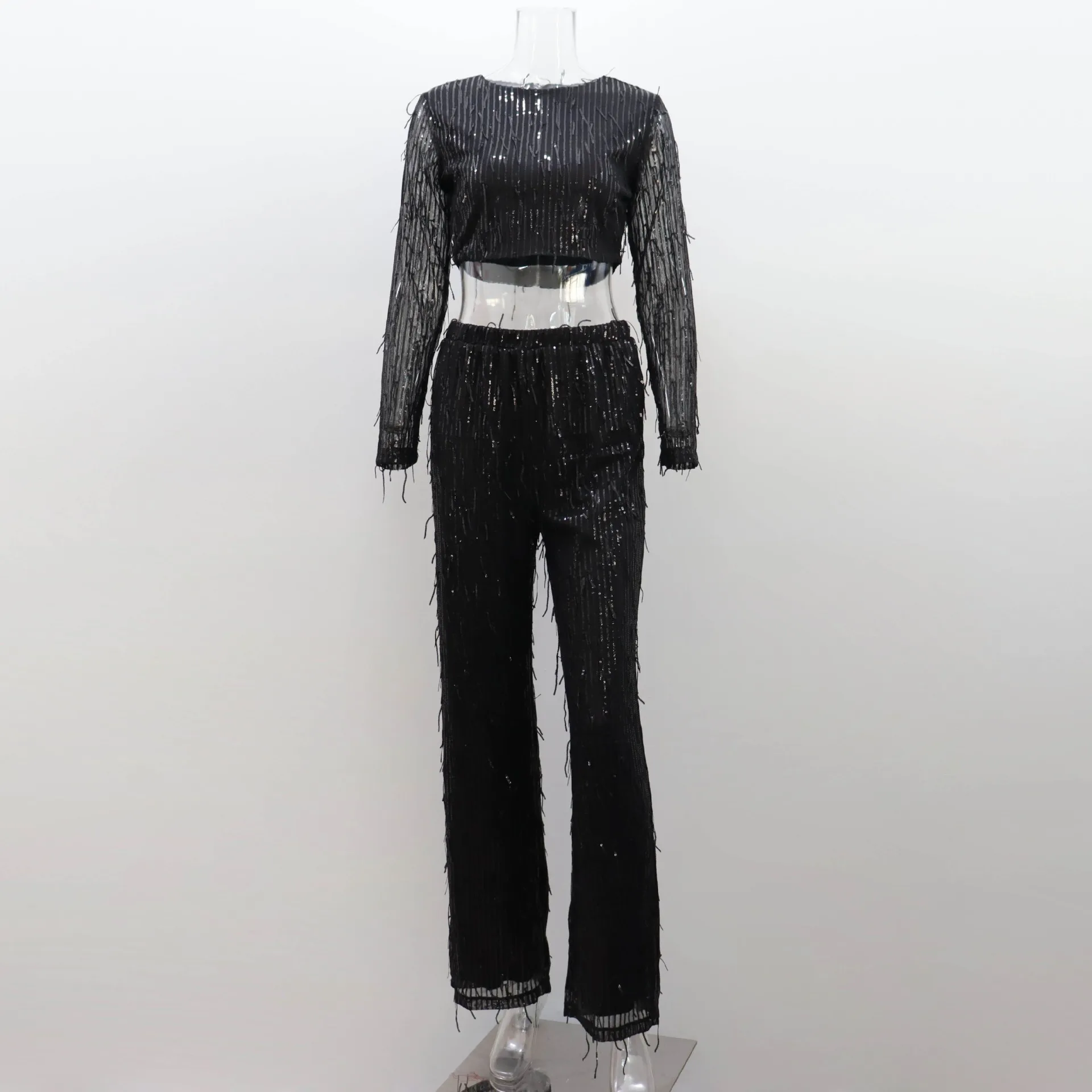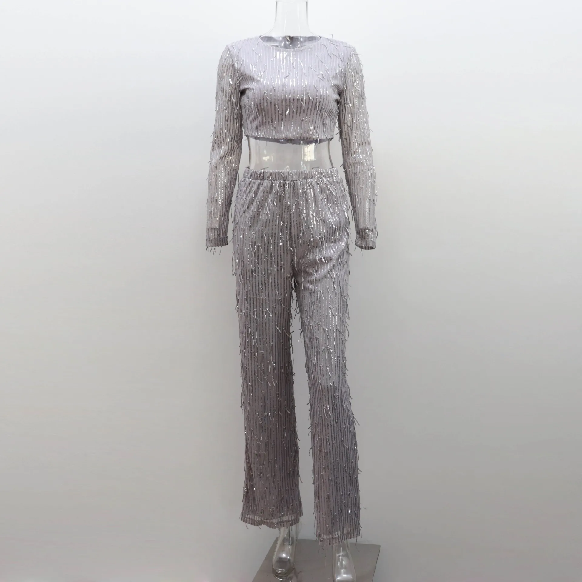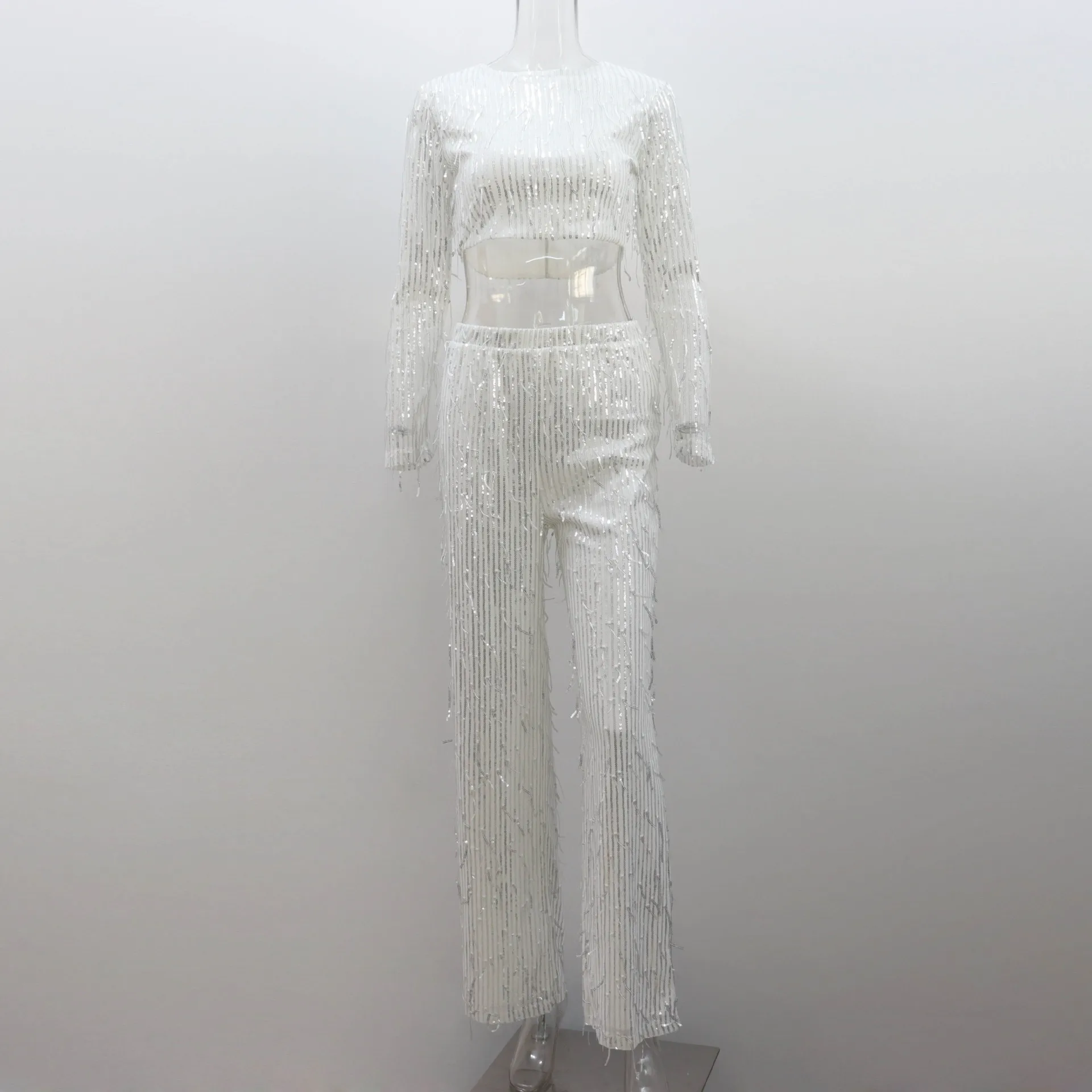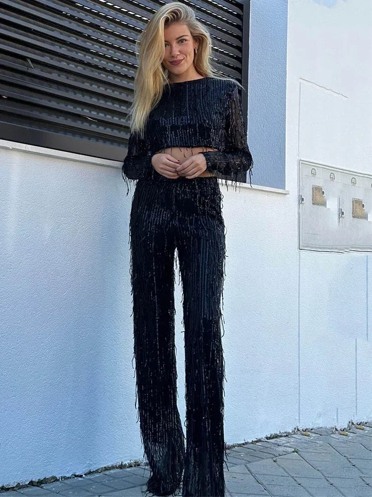 Women Tassel Sequin Party 2 Piece Set Autumn Winter Shiny Silk O-neck Crop Tops Wide Leg Pants Female Suit Fashion Street Lady S