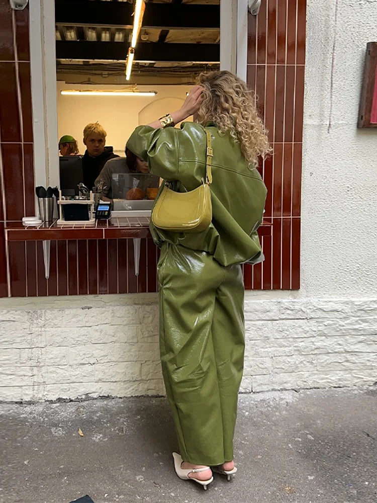 Y2K Pu Leather Women Skirt Set Street Solid Long Sleeve Stand Zippers Jacket Split Skirts 2025 Autumn Fashion Lady Outfit